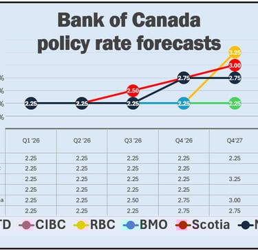 Economists widely predict the Bank of Canada’s policy rate to hover near ~2.25% through most of 2026 — signaling a hold pattern rather than further easing or cuts. (MortgageRatesNews.ca)