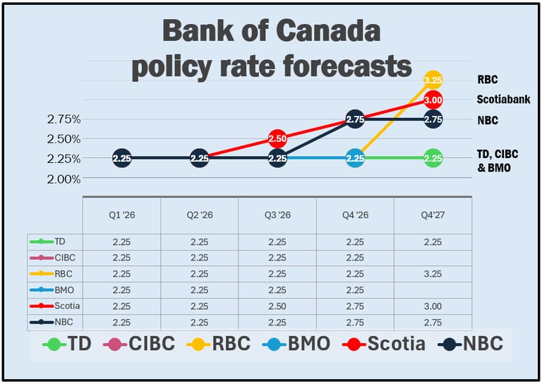 Some major banks foresee the possibility of a slight rise in late 2026, while others see rates unchanged through 2027. (MortgageRatesNews.ca)